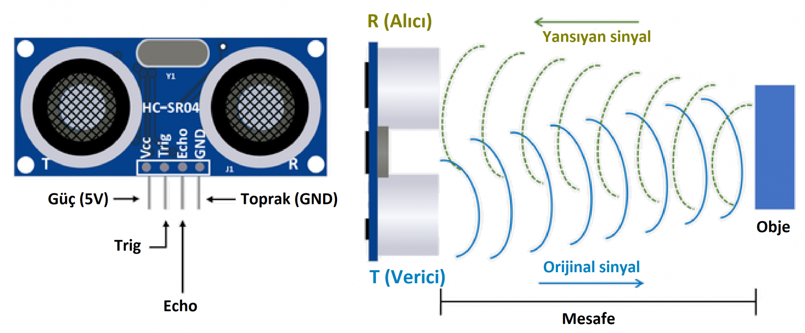 Görsel 1.2: HC-SR04 ultrasonik mesafe sensörü pin yapısı ve çalışma prensibi