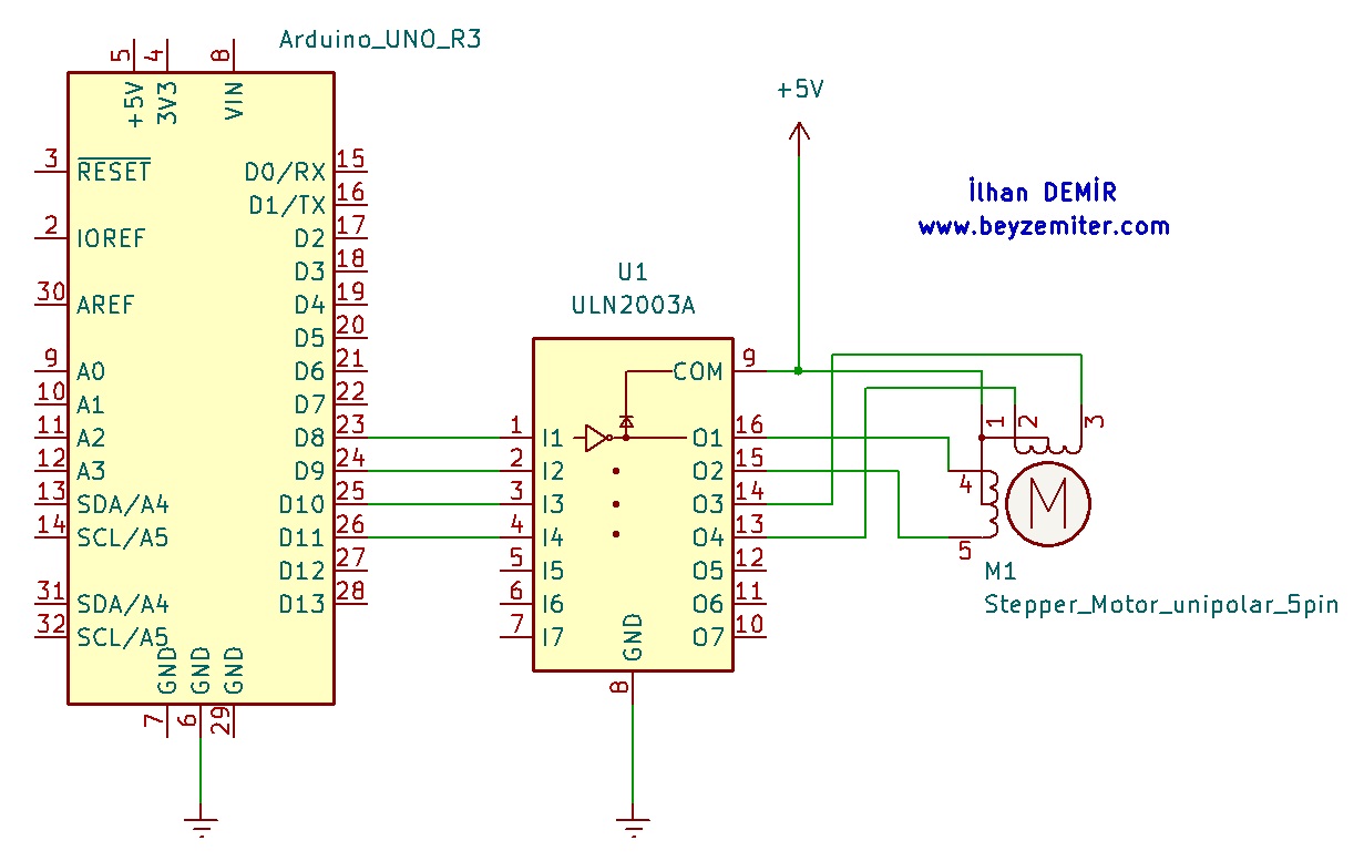 Görsel 1.6: Arduino Uno ile redüktörlü unipolar step motor uygulaması devre şeması (KiCad 7.06 ile çizilmiştir)