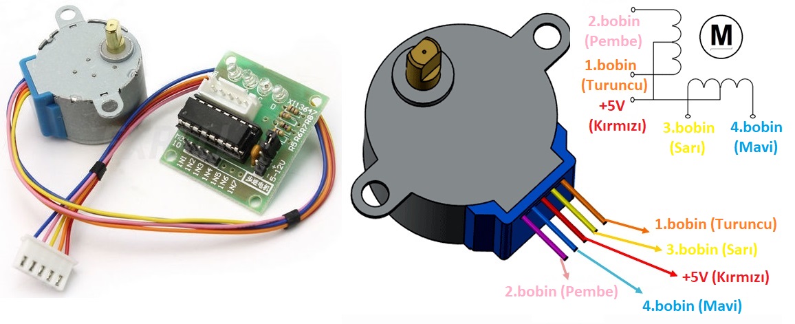 Görsel 1.2: Redüktörlü unipolar step motor, ULN2003A sürücü kartı, step motor pin yapısı