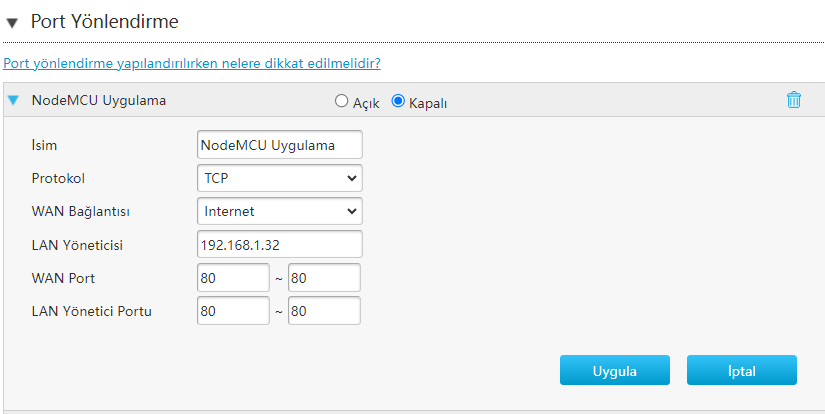 Görsel 1.1: Modem port açma/yönlendirme