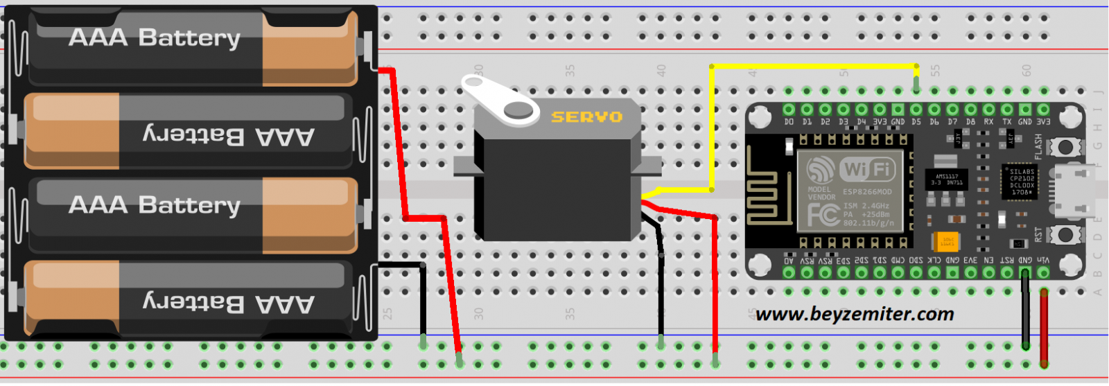 Görsel 1.6: NodeMCU V3 ESP8266 ESP-12E ile UART seri haberleşme servo motor kontrolü uygulaması breadboard bağlantısı