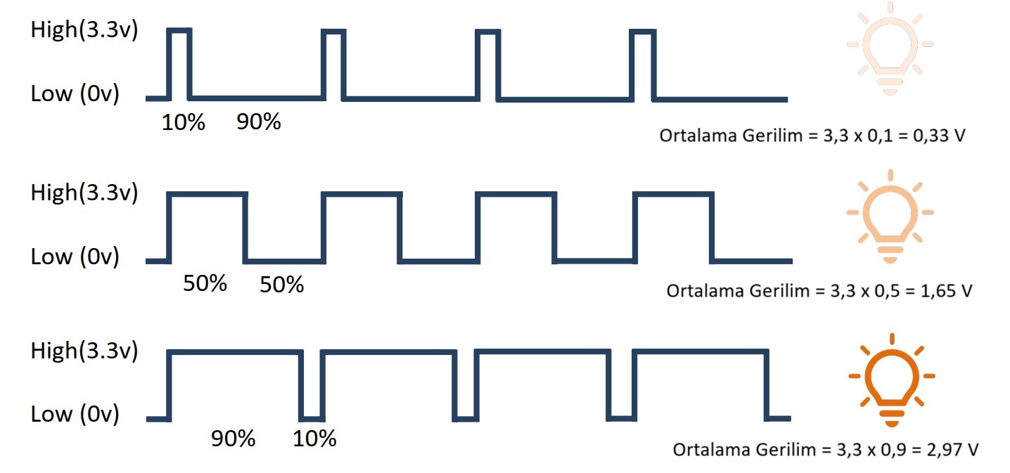 Bir LED diyotun parlaklığı, içinden geçen akım miktarını kontrol ederek belirlenir. Ancak bu, daha fazla donanım bileşeni gerektirir. Daha basit bir yöntem, LED'i gözün fark edemeyeceği kadar hızlı bir şekilde yakıp söndürmektir. LED diyotun açık ve kapalı olduğu süreleri kontrol ederek algılanan parlaklığı değiştirilebilir. Bu tekniğe PWM (Darbe Genişlik Modülasyonu) denir (Görsel 1).